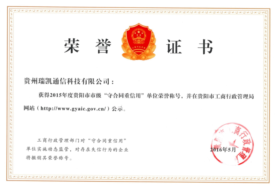 公司成立近十年以来,一直以“质量第一、信誉至上”为立身之本,自进入通信、电力、科技开发市场以来得以长足稳定的发展。主营收入、资产、上缴税费等主要经济指标,持续保持两位数增长。公司曾喜获贵州广电网络公司、威宁移动公司、赫章移动公司、瓮安供电局、修文供电局等业主单位颁发的荣誉证书及感谢信。2011年度被贵州电监办南方电网评为“综合评价暨诚信建设优良单位”,2015年荣升为贵州省通信行业协会副理事长单位,同年被贵州省通信管理局、贵州省通信行业协会评为优秀“民营通信建设企业”,从2000年至今分别连续2年、连续4年获贵州省、市工商行政管理局评定为“守合同、重信用”单位。
