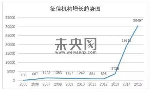 十年间征信机构(公司名称包含征信或者信用)数量整体呈上升式发展,尤其在14展达到顶峰,较13年增长424%(数据来源:水滴信用)。