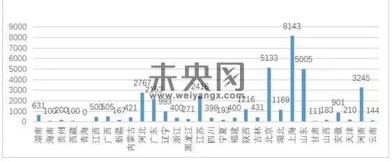 机构的地区分布与城市经济发展水平成正相关的趋势,排名靠前的是上海、北京、山东、河南、河北、江苏以及广东等,如图:
