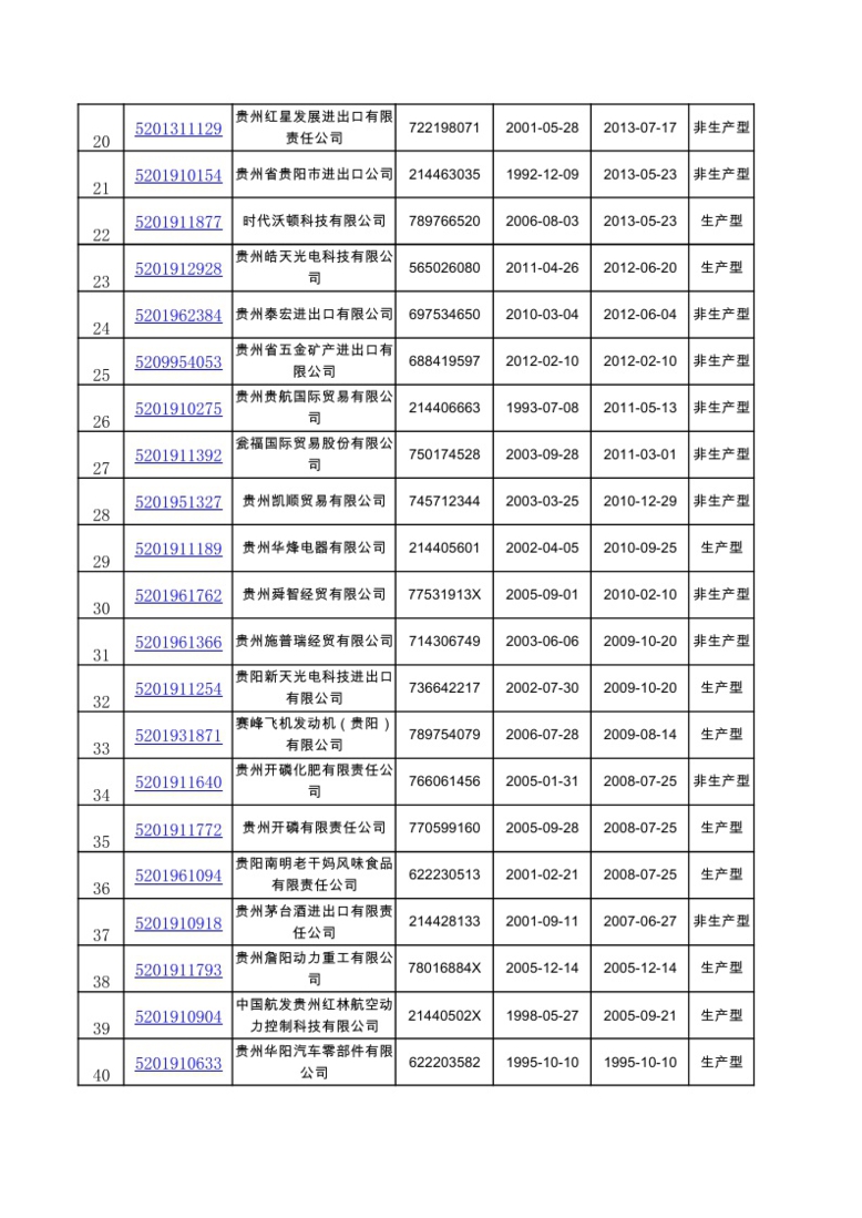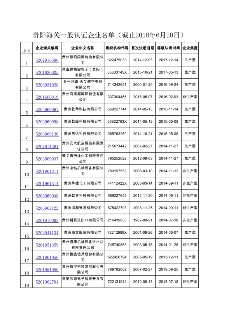 贵阳海关一般认证企业名单(截止2018年6月20日)